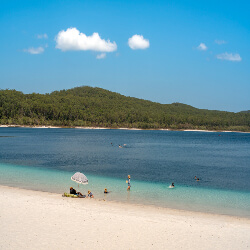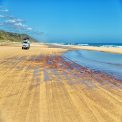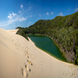 Fraser Island ist mit 120 km Länge und einer Fläche von 1.840 km² die größte Sandinsel der Welt. Sie liegt ungefähr 190 km nördlich von Brisbane und gehört zum Bundesstaat Queensland. Fraser Island hat eine geringe Einwohnerzahl von nur 360 Menschen, davon ca. 12 Aborigines. Obwohl Fraser Island eine Sandinsel ist, bietet sie eine vielfältige Vegetation und ist ein atemberaubendes Naturparadies. Aufgrund dieser ökologischen Einzigartigkeit wurde Fraser Island 1992 zum Weltnaturerbe erklärt. Durch Wind und Meer sammelte sich über mehrere Jahrtausende Sand an der Stelle, wo später Fraser Island entstand. Heute begegnen einem auf Fraser Island endlos weiße Sandstrände, beeindruckende Sandklippen, dichter Regenwald, Sümpfe, Buschland und zahlreiche glasklare Frischwasserseen. Die unglaubliche vielfältige Natur auf der Insel bietet vielen verschiedenen Tieren einen perfekten Lebensraum. So leben auf der Insel Soldatenkrabben, der reinrassige Dingo und weitere 40 Säugetierarten sowie 350 Vogelarten. An der Küste können seltene oder auch bedrohte Tierarten wie Delfine, Buckelwale, Meeresschildkröten und Seekühe beobachtet werden. In den Frischwasserseen leben zudem viele verschiedene Fischarten. Diese beeindruckende, nahezu unberührte Natur kann von den Touristen mit Allradfahrzeugen auf landwirtschaftlich reizvollen Rundstrecken oder auf Wanderwegen entdeckt werden. Neben der traumhaften Natur gilt aber auch das Maheno Wreck an der Ostküste als ein Wahrzeichen der Insel. Dieser Luxusliner strandete 1935 während eines Zyklons auf der Insel und wird nun von den Touristen erstürmt.